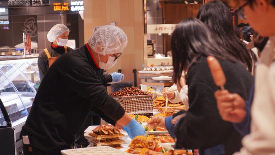 为增强卖场“烟火气”,熟食与烘焙区域得到了重点强化。熟食板块新增日邦寿司、双汇热卤、九多肉多、猪坚强等品牌,商品支数达到360支。其中,网红商品“小甜肠”以其外酥里嫩、爆汁口感及多种烹饪适应性受到关注;“国潮炸鸡”强调现制现售与8小时腌制,主打外酥里嫩。此外,顾客还能在此买到胖东来同款的香辣猪蹄、秘卤肉肠及韩式炸鸡。