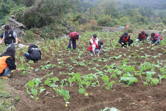 图为贵州黔南科技学院学生在惠水县民中村参与助农社会实践活动。