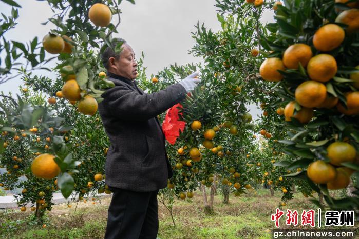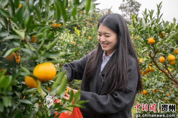 近日,贵州省务川仡佬族苗族自治县柏村镇长脚村柑橘大量成熟,果园里橘香四溢。游客穿梭在成片的果树之间,伸手摘下枝头亮橙的柑橘,现场一派忙碌而欢快的采摘景象。