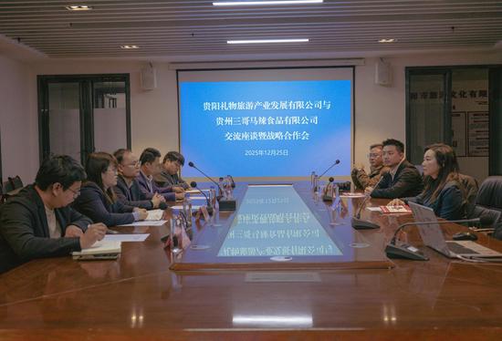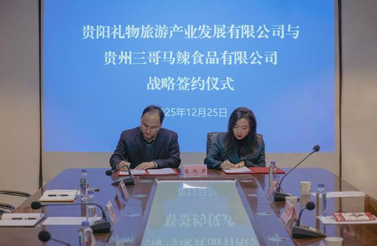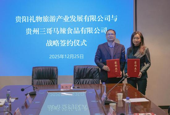 12月25日,贵阳礼物旅游产业发展有限公司(简称“贵阳礼物”)与贵州三哥马辣食品有限公司(简称“三哥马辣”)战略合作签约仪式在贵阳市观山湖区贵阳互联网金融特区大厦举行。双方将围绕联名产品开发、供应链资源共享、品牌营销赋能等方向展开深度合作,共同推动贵阳本土风味向文旅伴手礼转型升级,助力“爽爽贵阳”城市形象传播与文旅消费市场提质增效。