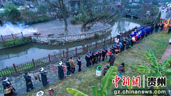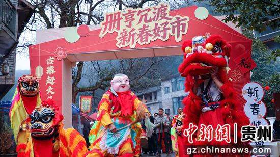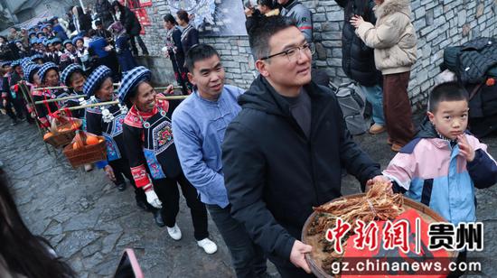 八方游客作客家肩头挑着土特产品入寨,威旁村民作为主家,端着醇香的拦门酒,唱起地道的布依族酒歌来迎接。主家捧着红通通的红鸡蛋,挨个塞到来客手中,传递着最真挚的祝福。现场唢呐迎新、龙狮闹春,傩戏祈福巡游为村民赐福。