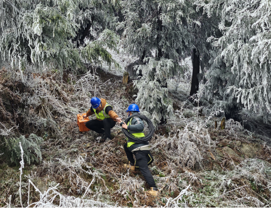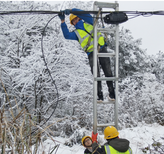 锦屏县平秋镇的抢修更是艰辛。故障点位于陡峭山坡,夜色已深,冰雪未融。抢修人员头戴照明灯,脚踩冰爪,在近乎垂直的坡面上艰难攀爬。荆棘划破手套,寒风穿透衣裳,他们架起长长的梯子,在凛冽的寒风中高空作业,对受损线缆进行排查与修复,经过数小时的连续奋战,受损线路全部修复,信号重新覆盖了这片山野。
