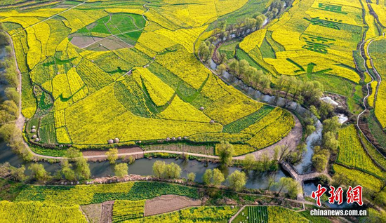 今天为大家推介的每日一图为航拍贵州省黔西市洪水镇的油菜花田。史开心 摄