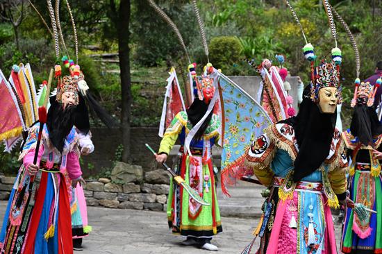 “咚!咚!咚!”鼓声一响,地戏演员们头戴面具、身披战袍,迈着刚劲有力的步伐登上舞台。高亢的唱腔、利落的身段,瞬间把人拉回到金戈铁马的年代。传统地戏演的是征战沙场的忠勇故事,新编的《杨家将·护花》把“保家卫国”的忠勇精神,和花朝节“护花祈愿”的美好寓意巧妙融合在一起。演员们动作刚劲、唱腔激越,演绎的是出征护花的英勇场面,传递了守护美好的愿望。