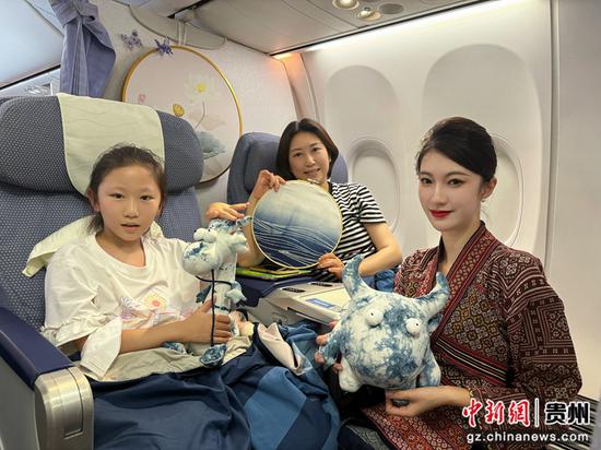 中新网贵州新闻8月16日电(记者 袁超)银项圈、花发簪、蜡染衣、刺绣虎、扎染牛……近日,在上海浦东机场飞往贵阳的CZ3658航班上,176名旅客共同见证了一场由南航贵州公司乘务组带来的“非遗”展示暨惊艳亮相。