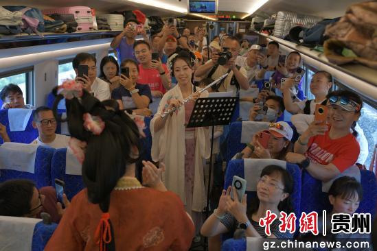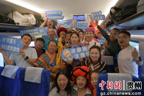 在四趟专列上,赛事组委会为选手们精心准备了一份本地伴手礼,内含六盘水当地详尽的旅游攻略、美味特产。组织演员为旅客展演芦笙舞、高山流水等独具特色的民族表演,为选手们的凉都之行增添了一份温馨。