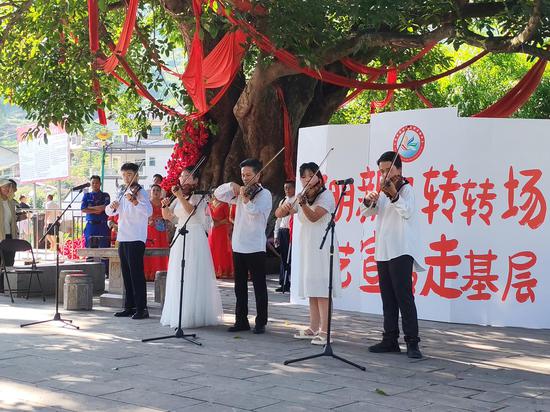 文艺搭台,唱响新风主旋律。惠民文艺演出在欢快的音乐快板《酒都民谣》中拉开序幕,朗朗上口的旋律展现仁怀独特地域文化;男声独唱《期待爱》、舞蹈《我爱你中国》等节目情感真挚,赢得阵阵掌声;二胡与小提琴演绎的《十五的月亮》《赛马》《红星歌》等经典曲目,勾起集体记忆,传统与现代艺术交融生辉;女声独唱《太阳最红毛主席最亲》深情款款,传递家国情怀;歌舞《芦笙奏响婚事简办新风尚》则以生动表演倡导移风易俗,将文明新风吹入人心;组合唱《文明在哪里》用朴实歌词和优美旋律引导村民反思践行文明行为。