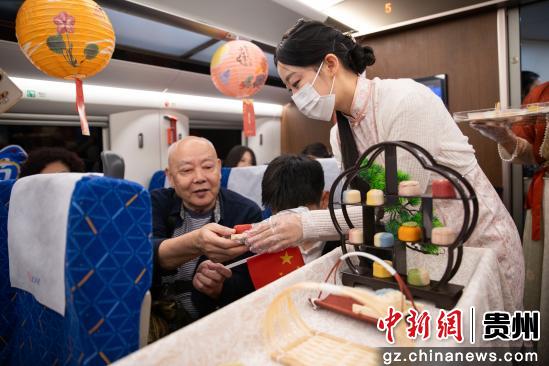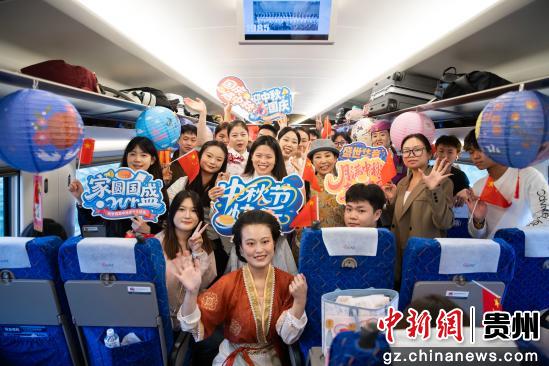 中新网贵州新闻9月30日电 (廖佳 张凤娇)30日,国庆与中秋“双节”假日即将开启之际,贵阳客运段在遵义开往六盘水D8599次列车上举行庆祝活动。特色节目表演、“心愿便利贴”互动、猜灯谜游戏等环节在D8599次列车5号车厢依次上演。