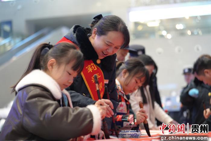 2月2日,在广铁集团怀化车务段铜仁站,工作人员与小朋友们用毛笔一起写福字。申逸恺 摄