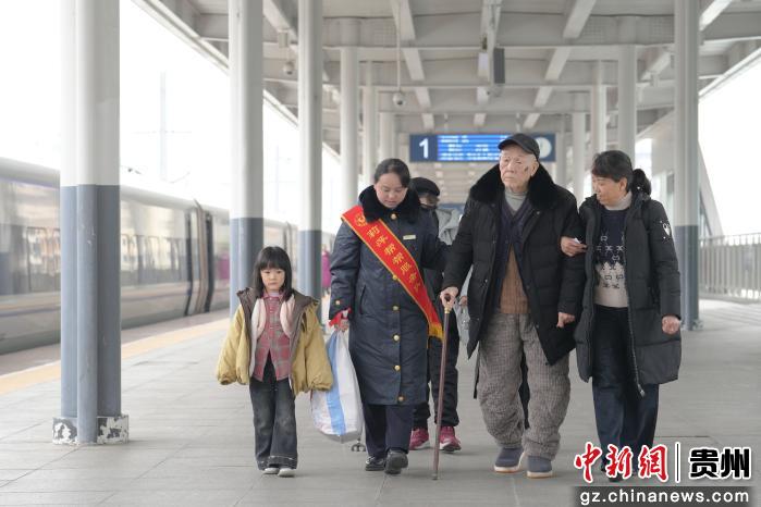 2月2日,广铁集团怀化车务段铜仁站,工作人员正在帮助旅客乘车。申逸恺 摄