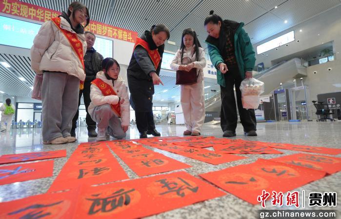 2月2日,在广铁集团怀化车务段铜仁站,工作人员与大家一起查看刚撰写的春联。申逸恺 摄