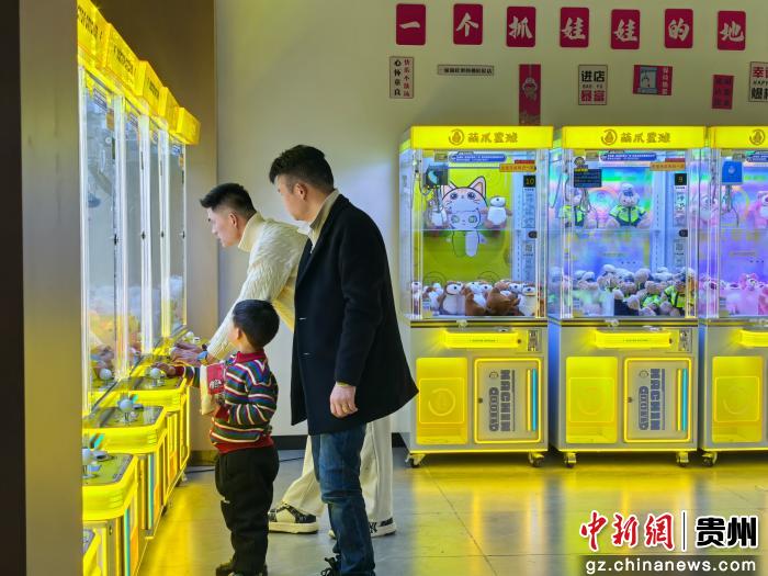 图为2月14日,旅客在贵州省铜仁市向阳服务区(杭瑞高速杭州方向)内体验抓娃娃机。石小杰 摄