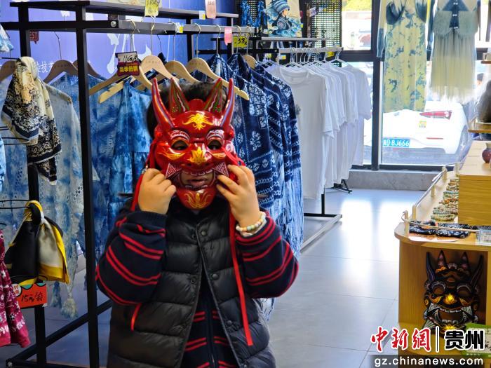 图为2月14日,旅客在贵州省铜仁市向阳服务区(杭瑞高速杭州方向)内体验傩戏面具。石小杰 摄