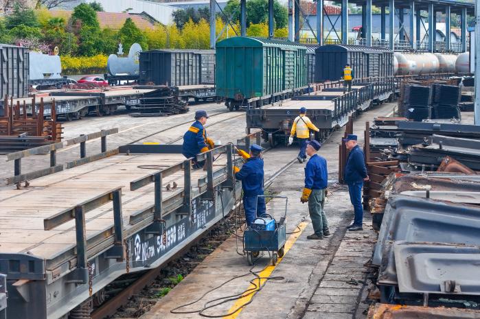 此次改造,重点对28辆防洪平板车进行加装防护护栏专项施工。作业人员严格按照技术标准,精检细修、规范作业,在车辆主体牢固加装高强度安全护栏,同时对走行部、制动系统及车钩缓冲装置等关键部位进行全面检修,显著提升车辆在防汛物资、抢险机具运输过程中的安全性和稳固性。