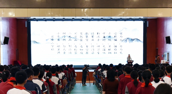 随着上课铃声响起,主题日活动在学校的千人体育馆正式开始。伴随着韵律优美的音乐,同学们齐声诵读《食安三字经》。《食安三字经》将科普教育与青少年日常所学巧妙融合,放入了同学们每日每餐“舌尖上的安全”与中国传统文化代表“三字经”的巧妙创新,成为了活动经典情景之一。“买食品,看标签,不贪吃,营养全……”,将科普知识融入到朗朗上口的韵律声中,蕴含着青少年认知与理解的《食安三字经》演绎,这种创新的科普方式得到了师生的一致欢迎。