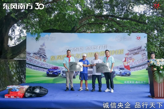东风南方携东风日产、启辰全国车主代表走进榕江县古州镇口寨村小学开展爱心助学活动,组织全国车主球员代表与口寨村足球队进行友谊赛。