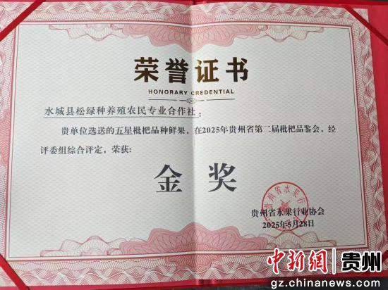 中新网贵州新闻5月29日电(何剑江)5月28日,在2025年贵州省第二届枇杷品鉴会上,六盘水市水城区阿戛镇选送的“五星枇杷”品种鲜果经评委会组综合评定,荣获金奖。