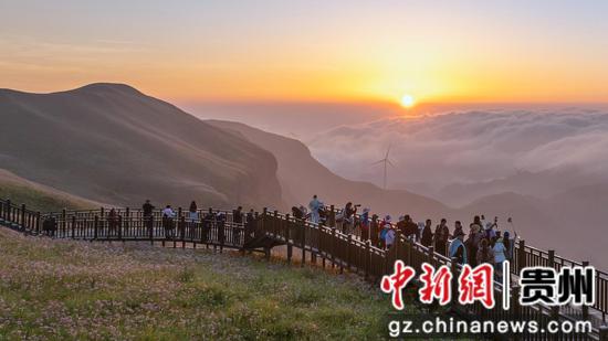 2024年8月25日,游客在贵州省毕节市赫章县阿西里西·韭菜坪景区内观赏日出(无人机照片)。李华 摄