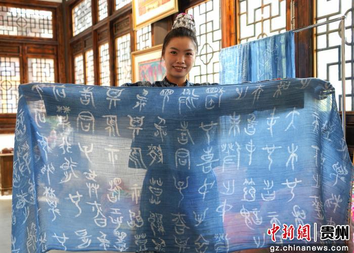 图为贵州织金苗族姑娘王秋雨展示自己制作的蜡染围巾。周燕玲摄