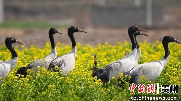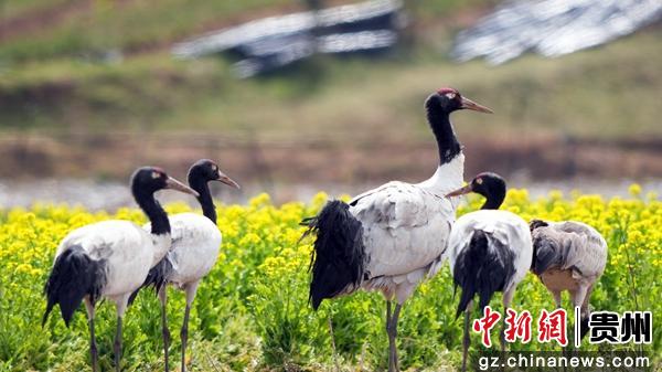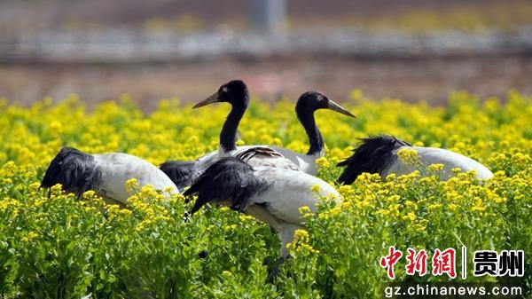 2月25日,国家一级保护动物黑颈鹤在贵州省毕节市威宁彝族回族苗族自治县草海镇中海村油菜花地里觅食,或低头细啄,或翩翩起舞,构成了一幅生机勃勃的春日画卷。赵庆能 摄
