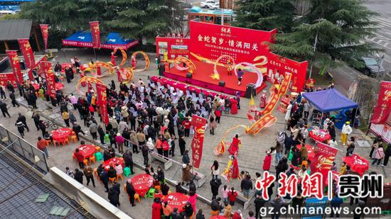 中新网贵州新闻1月16日电(记者 袁超)15 日,正值农历腊月十六,贵阳市观山湖区长岭南路数博大道阳关小区外的小广场上热闹非凡,处处洋溢着喜庆的节日氛围。由观山湖区长岭街道、观山湖区观山街道指导,贵阳市阳关饲养场、白鹭湖社区主办,贵州阳关大曲酿酒有限公司承办的 “金蛇贺岁・情满阳关” 活动举行。