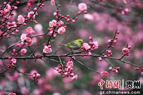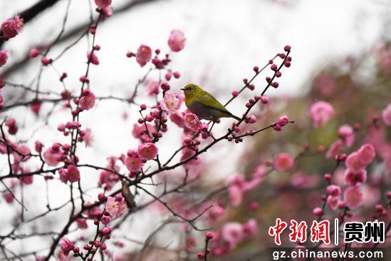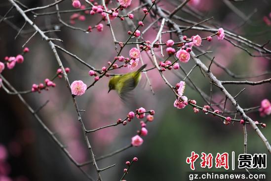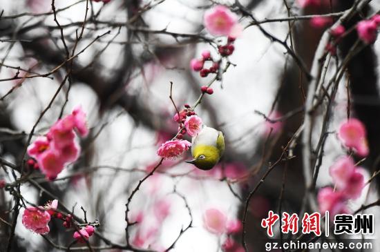 立春节气临近,贵阳市甲秀广场的梅花竞相绽放,小鸟在梅花丛中觅食休憩,与花朵相映成趣,绘就出一幅鸟语花香迎春来的美丽画卷。(赵松 摄)