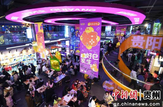 春节假期,贵阳市南明区青云路步行街灯光璀璨、游人如织,人们在这里赏街景、看表演、品美食,感受浓浓的年味。(赵松摄)