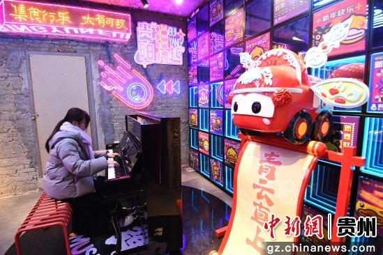 2月1日,市民游客在贵阳市南明区青云市集内弹共享钢琴。