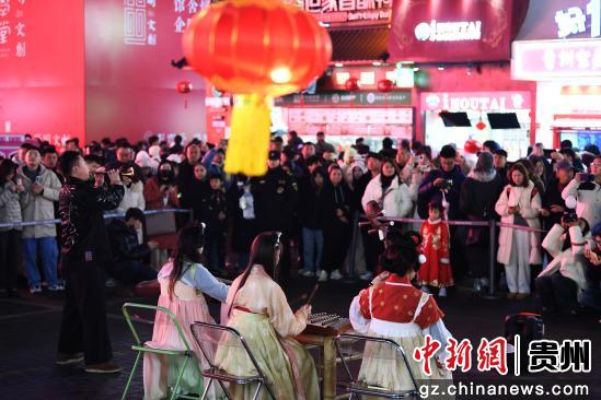 2月1日,市民游客在贵阳市南明区青云市集内观看表演。