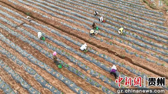 中新网贵州新闻6月9日(李锦明 陆劲松 何欢)夏日里,漫步贵州省清镇市麦格乡,只见山峦叠翠,绿意葱茏。在小靛山村豆腐冲组,连片农田里,垄沟蜿蜒如诗,西瓜藤蔓肆意舒展,豆苗迎着阳光拔节生长,工人们穿梭其中,精心为辣椒苗梳理理枝叶,一幅生机勃勃的田园画卷徐徐铺展。