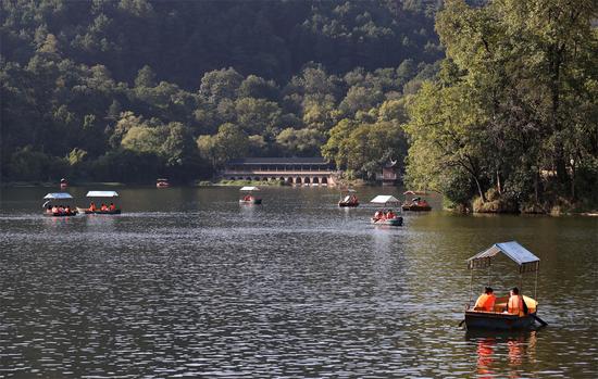 黔灵湖畔,一个寻常周末的午后。夏日的暖风挟着水汽,拂过树影婆娑的岸边步道。湖面上三三两两漂着几艘游船,几个年轻人随意坐在湖边的露营椅上,细密的水雾在咖啡杯上升起又弥散开来。临湖的咖啡馆门口支起三两把遮阳伞,伞下几张桌子几乎坐满,有人低头看书,有人对着电脑敲字,也有人支着下巴,望着湖对面的青翠峰峦发呆。