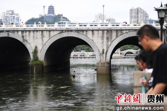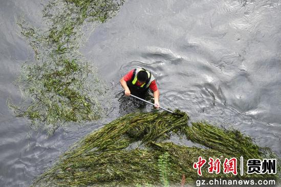8月13日,贵阳市河湖保护中心的河道疏捞工人正在清理南明河中心城区河段水草。