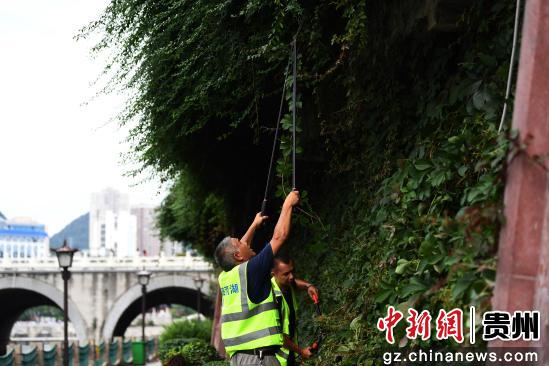 8月13日,贵阳市河湖保护中心的河道疏捞工人正在对南明河河段两岸的绿化进行修枝剪叶。