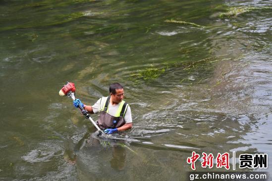 近日,贵阳市河湖保护中心针对南明河中心城区河段水草、河段两岸绿化等开展综合治理。(赵松 摄)
