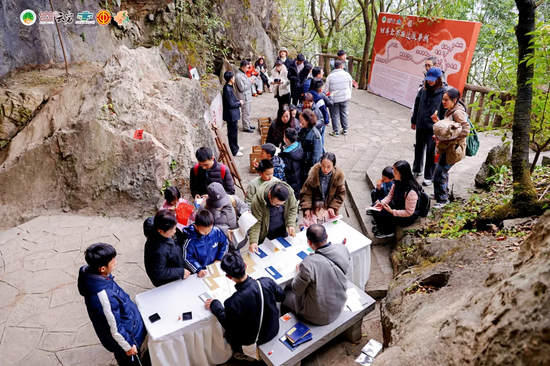 在精心布置的实景场地中,大家循着任务线索,穿梭于“烽火授命·黔程之始”“黔垣问书·四色核验”“文澜四序·弦歌不断”“二四惊变·临危转藏”“晴台曝卷·古法新承”“地母洞窟·秘藏归箱”“文澜新生·逐光践行”等多个主题场景,通过部分还原、人物对白、任务打卡等形式,进行沉浸式情景演绎,一步步揭开文澜阁《四库全书》西迁途中的艰辛与传奇。
