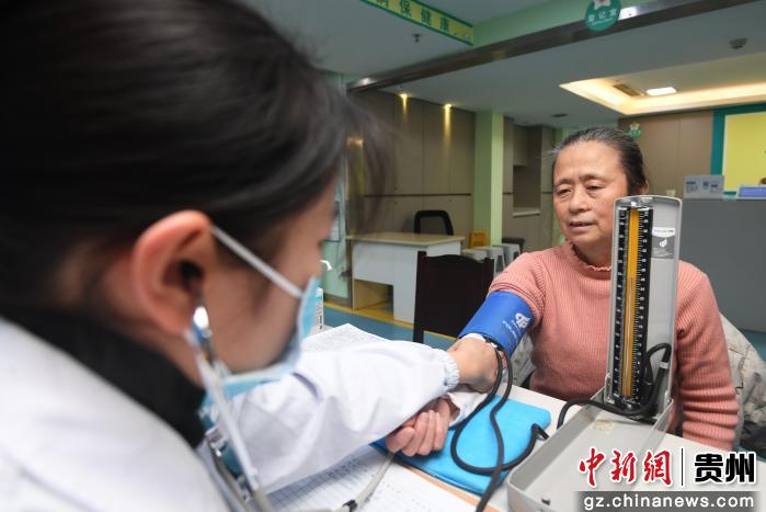 1月29日,贵阳市南明区新华路街道社区卫生服务中心的医护人员正在为老年人测量血压。