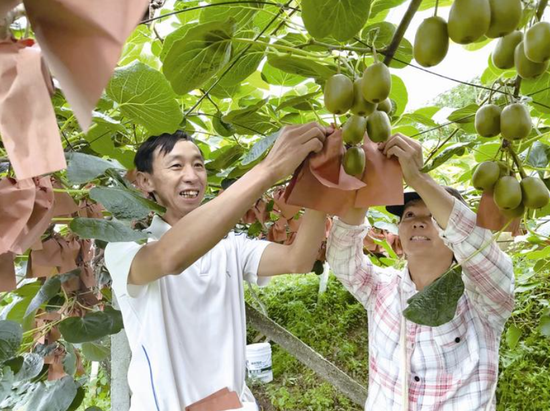 眼下,正是猕猴桃夏季管护的关键时刻。走进水城区猴场乡漫山遍野的猕猴桃果园,茂盛葱茏的叶片下,一串串猕猴桃缀满枝头,微风吹拂下,累累硕果随风摇曳,煞是喜人。果农们在果园里来回穿梭,正忙着给猕猴桃疏果、剪枝、浇水,脸上透露出期待丰收的喜悦。