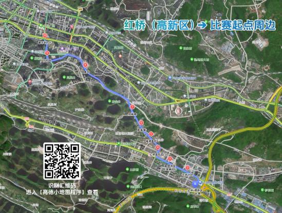 红桥(天海加油站)→红园路→红桥大道→青山路(西南家居)→凉都大道→凤凰路辅路→凤凰东路→星俪岚酒店→凉都明珠处右转至大连路→大连路→大连路与凉都大道处右转→凉都大道→比赛起点周边(锦华新时代)
