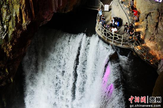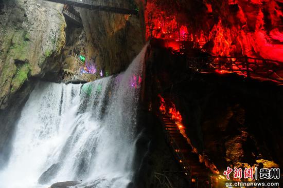 贵州奢渡河峡谷景区位于“中国凉都”六盘水市水城区境内,景区四周山峦似翠屏环抱,洞中瀑布如银帘轻洒,阳光从峡谷间倾泻而下,为冷峻的岩壁铺上一层暖意。游客可以乘低空缆车俯瞰峡谷美景,漂流而下,在随波逐流中观赏两岸奇观,尽享惬意。(黄庆松 摄)