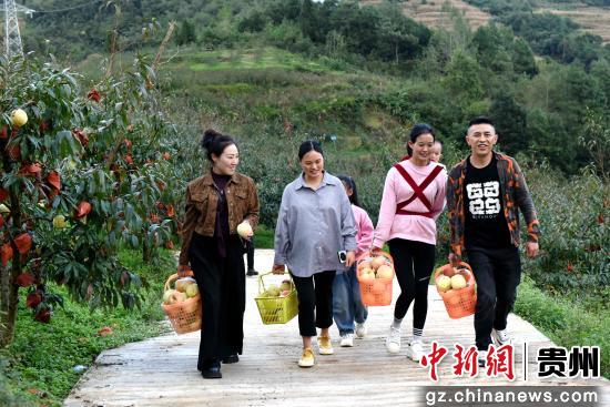 近日,贵州省六盘水市钟山区保华镇阿勒河村“凉都蜜堻堻”冬桃基地种植的冬桃丰收,一颗颗套着果袋的冬桃缀满枝头,果农、工人及游客穿行在果园间采摘、转运、整理冬桃,现场一派繁忙丰收景象。