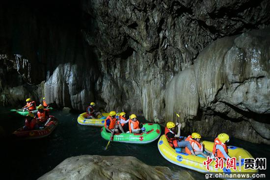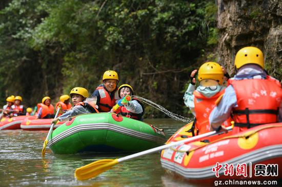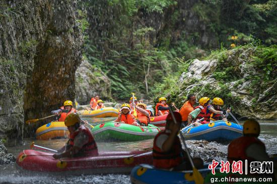 近日,贵州省黔东南苗族侗族自治州黄平县野洞河镇漂流景区迎来游客高峰期,吸引来自省内外1500余名游客纵享凉爽时光。