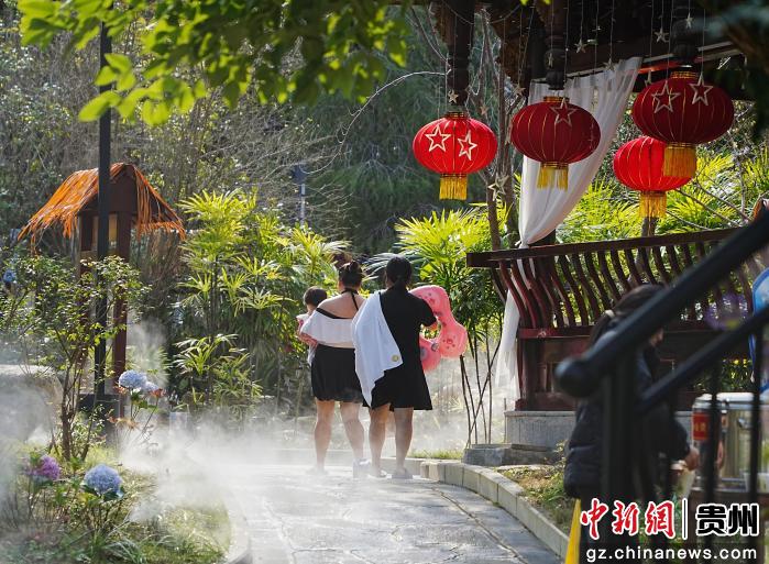 图为游客在剑河仰阿莎温泉小镇准备去泡温泉。