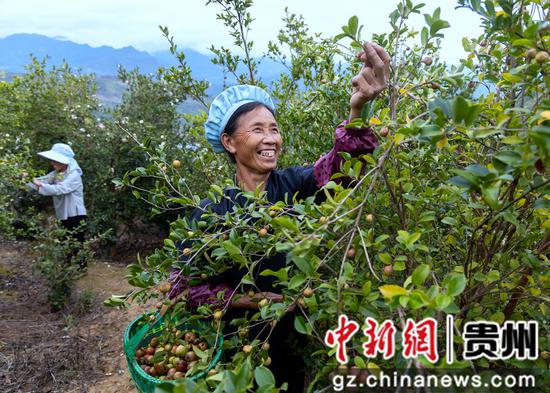 村民在贵州省黔南布依族苗族自治州罗甸县凤亭乡联明村采收油茶。班方智 摄