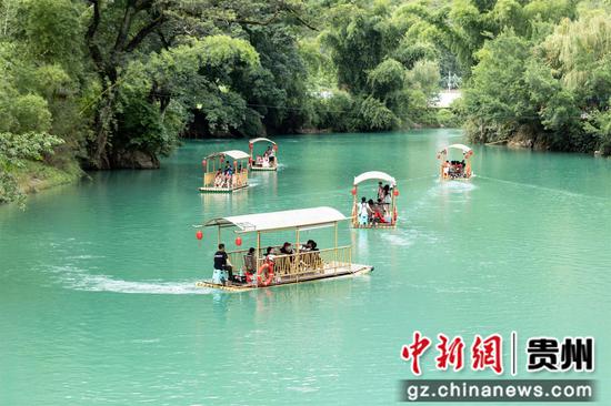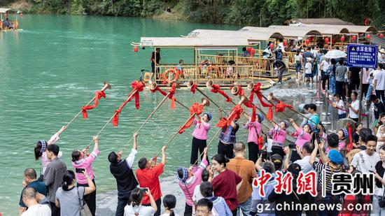 2025年10月1日,游客在贵州省黔南布依族苗族自治州罗甸县沫阳镇大小井风景名胜区乘坐竹筏游玩。