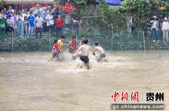 2025年10月1日,游客在贵州省黔南布依族苗族自治州罗甸县沫阳镇大小井风景名胜区体验稻田摸鱼。