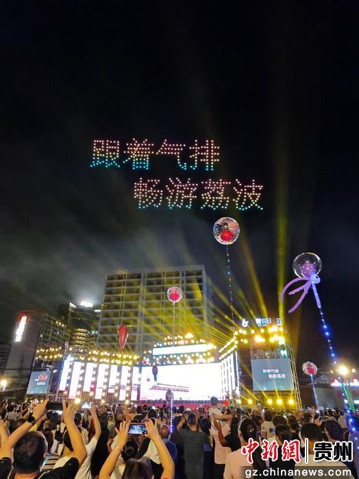 数百架无人机腾空而起,在夜空中编织出“76周年”“五星红旗”“大美荔波祝福祖国”等图案和字样,共同谱写对祖国76周年华诞的祝福;组合成“民间气排球公开赛(荔波站)”“跟着气排畅游荔波”等气排球运动造型图案和字样,为所有的参赛运动员加油喝彩。光影流转间,科技之美与人文之韵交相辉映,引得现场观众阵阵惊叹。