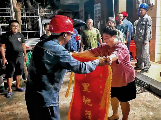 中新网贵州新闻9月16日电(毛涵 陈子健 周宇萍)“真心感谢你们帮助我们恢复了供电,让我们早日回到正常的生活!”15日,海南省文昌市东阁镇宝芳墟居民把一面印有“千里驰援”字样的锦旗亲手赠送给南方电网兴义供电局册亨救援队负责人陈星明的手上,表达了当地居民对救援队伍的崇高敬意和深深感激。