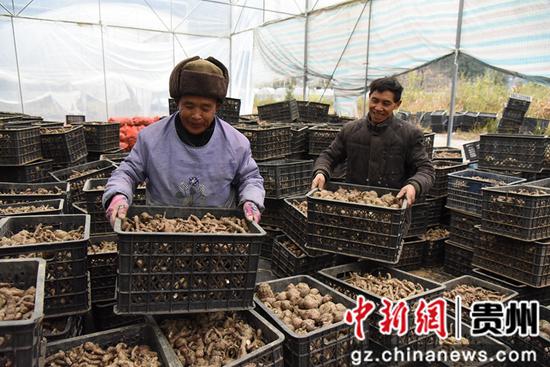 在贵州册亨县大寨村惠册协作魔芋现代农业产业园,群众整理采收的魔芋。