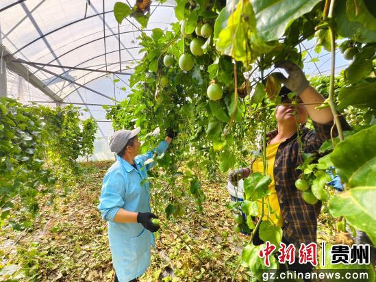 中新网贵州新闻11月5日电(王鹏)当下,正值百香果收获季节,走进贵州省铜仁市万山区敖寨乡中华山村百香果种植基地,只见成片的百香果绿意盎然,翠绿的藤蔓爬满棚架,圆润饱满的百香果缀满枝头,微风吹过,空气中弥漫着淡淡的果香。果农们忙碌地穿梭于一排排百香果藤架间,认真挑选着成熟的百香果,经过分拣、打包、装箱后发往全国各地。