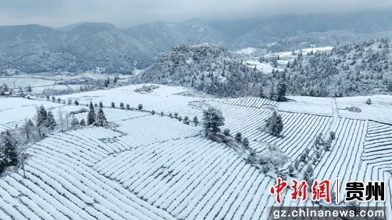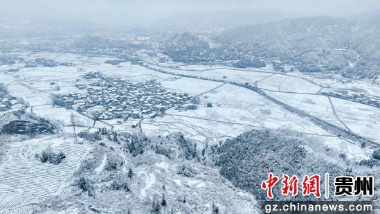 1月9日,贵州省松桃苗族自治县高海拔乡镇迎来降雪,沿着G352线乌罗镇路段,白雪落在在茶园里、大坝上,民居、茶园、大坝、公路勾勒出冬日水墨画。(谢慧芳 戴刚)